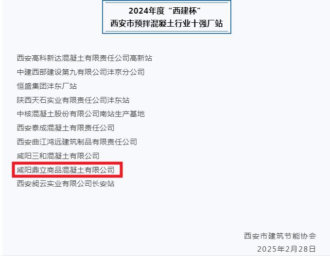 祝賀我公司榮獲2024年度“西建杯” 西安市預(yù)拌混凝土行業(yè)十強(qiáng)廠站榮譽(yù)稱號(hào)